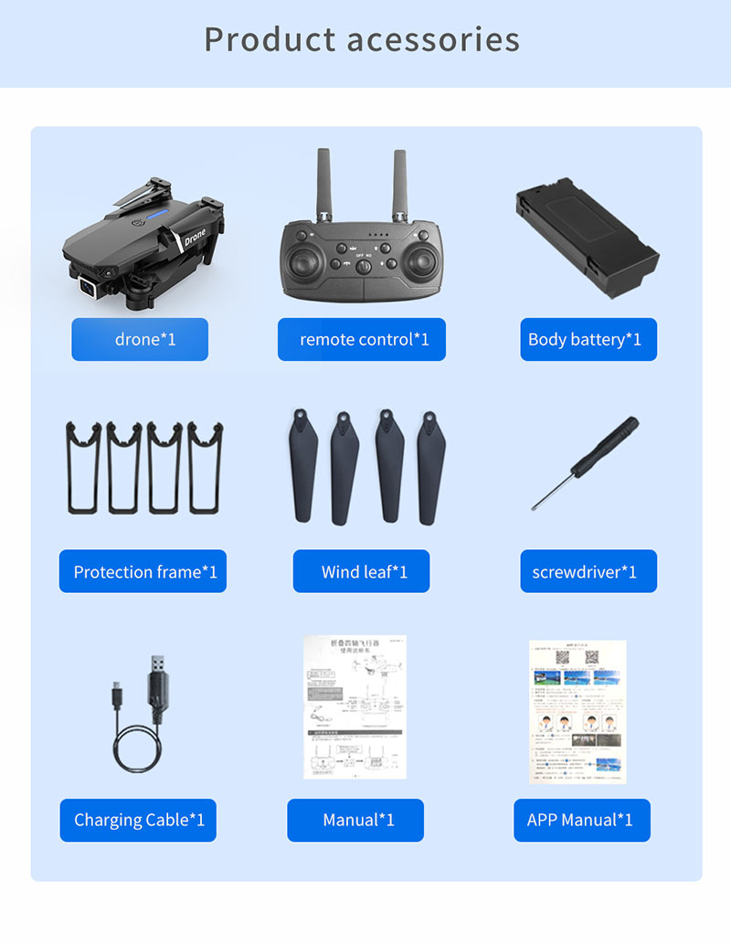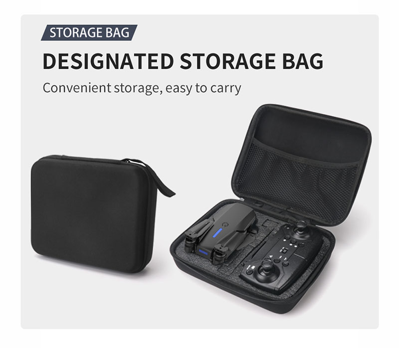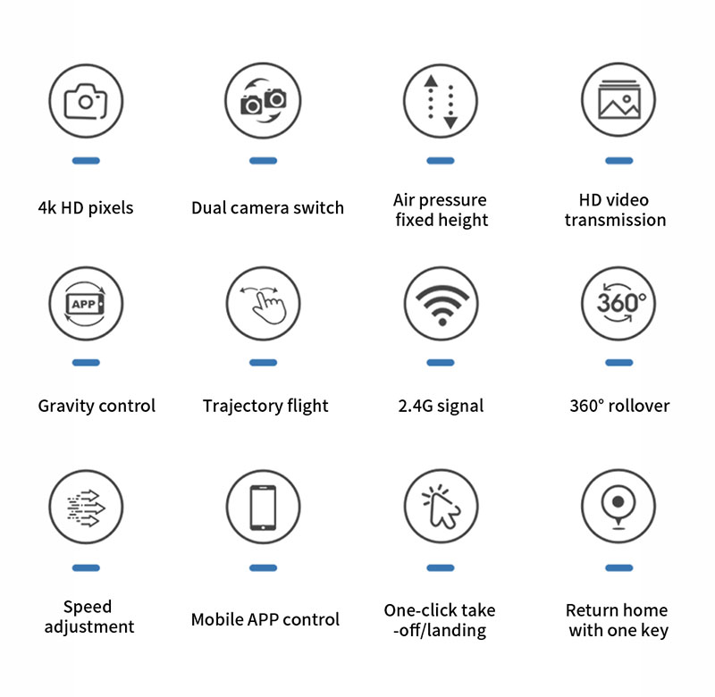 Up/down, Forward/backward, Turn left/right, Sideward flight, 3-level flight speed, LED Light, Headless Mode, One Key Automatic Return, Altitude Hold Mode, WiFi FPV, Trajectory Flight, Camera/Video