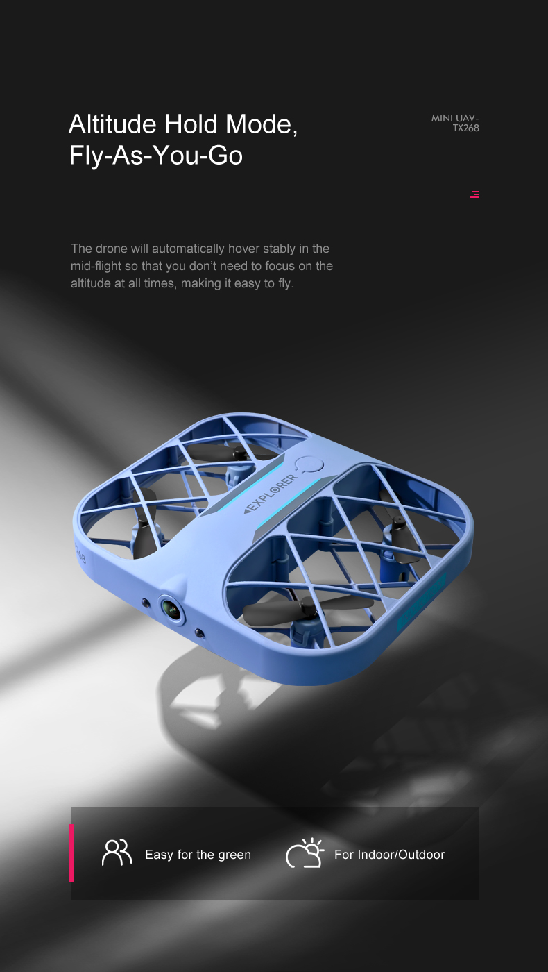 Altitude Hold : Enables drones to Auto-Hover. The drone can stay at a certain height when your hands are off the controller.pls try it indoor without wind.