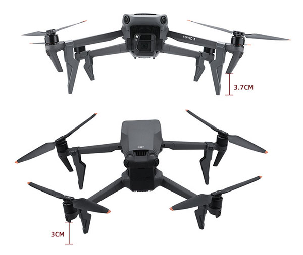 1. The height of the front landing gear is increased by 3.7cm, and the height of the rear landing gear is increased by 3cm, which can effectively prevent the ground debris from contaminating the body or damaging the gimbal and body during take-off and landing;