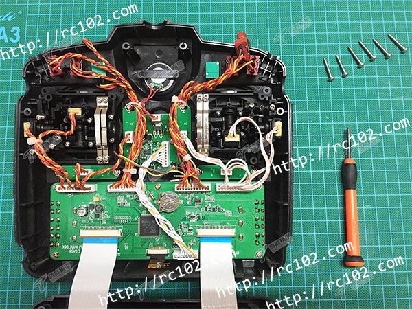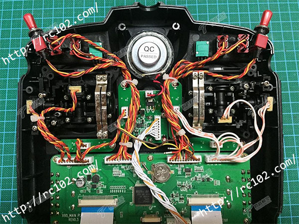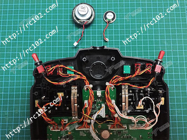 1. Take out the Taranis battery (when you are using the controller, please turn it off first), remove the 6 screws on the back of the remote control, and then open the case, you will see a small speaker in the front case (as shown below) ). There are only 2 ordinary electronic wires to connect the speakers to the circuit board (the upgraded speakers use ultra-soft, low-impedance, high-quality silicone wires).