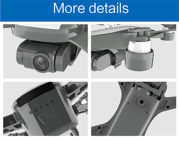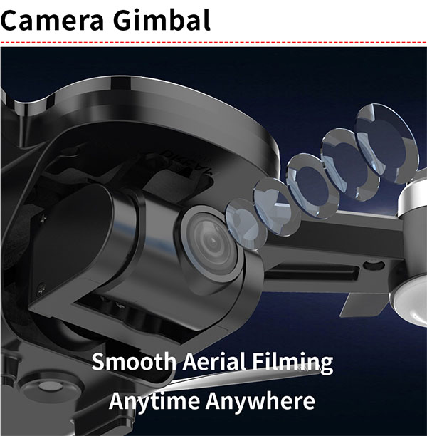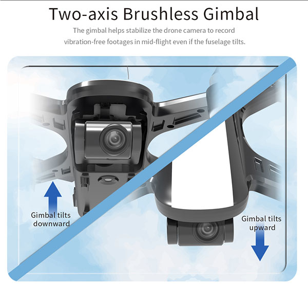 - 4K HD Camera Gimbal, 5G WIFI FPV. It is equipped with 4K camera, 4K videos and photos, tuned amazingly to capture pictures and videos from the sky, also with two-axis brushless gimbal,helping the drone record vibration-free footages.