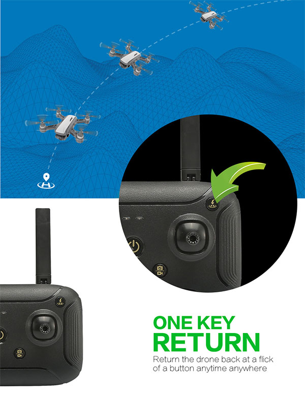 - One Key Takeoff /Landing. One press automatically taking off or landing, the drone will take off or go back to the position where it took off.