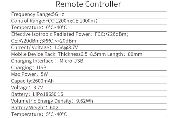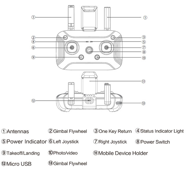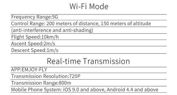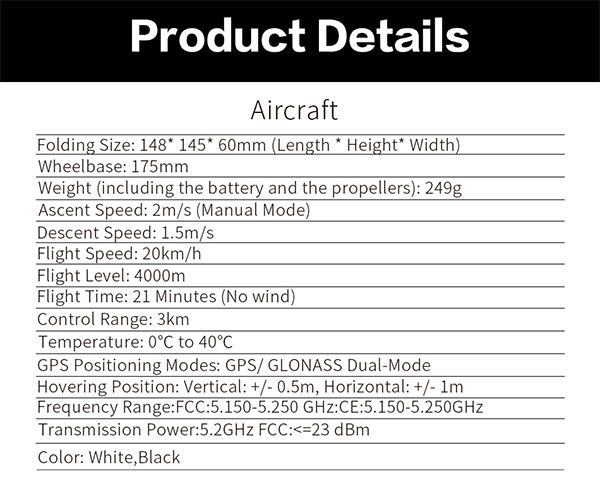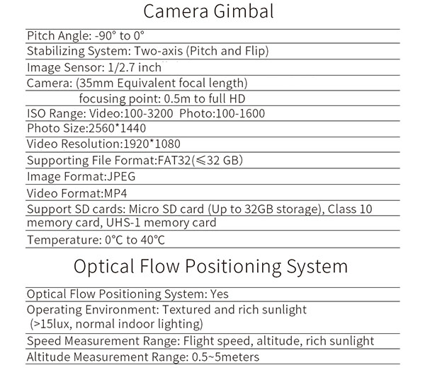 Function: Forward/backward, Turn left/right,Up/down, Camera, FPV, GPS, Altitude Hold Mode, Continuous Shooting, Headless Mode, One Key Automatic Return, One Key Follow, One Key Landing, One Key Taking Off, Optical Flow Positioning, Point of Interest