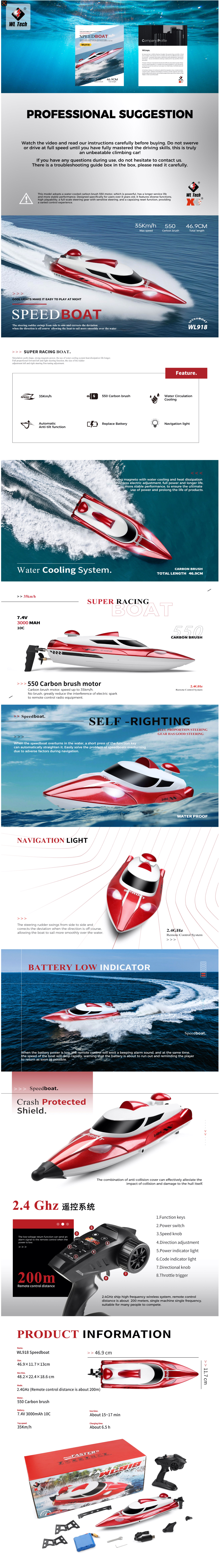 Cool appearance, driving speed of about 35KM/H, using water-cooled cooling carbon brush 550 motor, with abundant power and longer service life, more stable performance, ensuring power and extending product life. Fully proportional servo motor has sensitive steering It has the function of reversing the ship. The low voltage feedback function can send an alarm signal to the remote control when there is low power. Cool lighting can also make it easy to play at night.